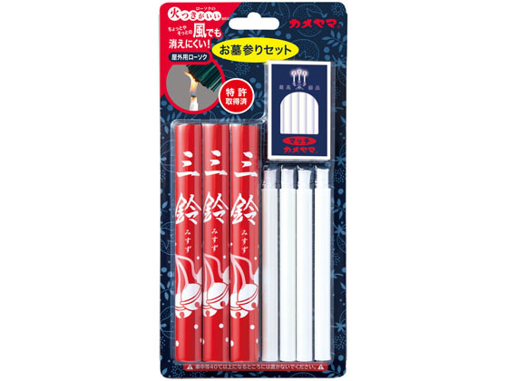 【商品説明】カメヤマが新しく考案した構造(特許取得済)のローソクです。炎が安定しているので野外でも着火が簡単で、ロウが流れにくく、ススも少なめです。【仕様】セット内容:お墓参り用お線香 3本、屋外用安全ローソク 3本、マッチ bousai0105