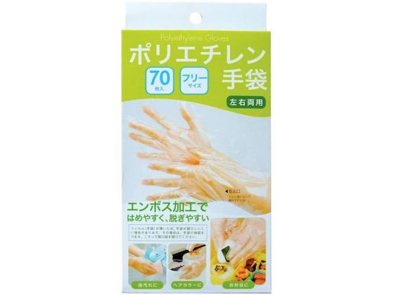 【商品説明】はめやすく、ぬぎやすい外側(凹凸)加工を施しています。 使い切りタイプで手軽に使用でき、手を清潔に保ちます。 便利な左右両用タイプ。 本品は食品衛生法、厚生省告示第370号に適合しています。【仕様】●エンボス加工 ●色:クリア ●サイズ:フリー ●全長:28.0cm ●厚さ:0.02mm ●注文単位:1箱(70枚) ●材質:ポリエチレン ●用途:調理・清掃・毛染め 【注意事項】 アレルギー反応等により、体質によっては、かゆみ、かぶれ、発疹等をおこすことがあります。異常を感じたら使用を中止し、医師に相談して下さい。