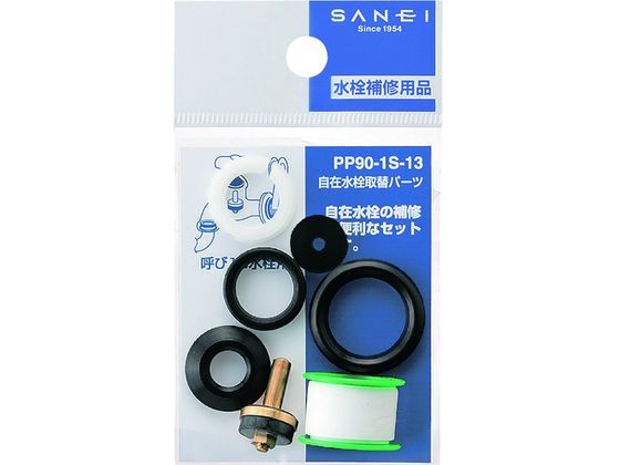 【仕様】●型番:PP90-1S-13 ●入数:1個 ●呼び径(mm):13 ●黄銅、ポリアセタール、EPDM、NBR、PTFE ●三角パッキン×1個、パイプ用Uパッキン×1個、リング×1個、ケレップ×1個、水栓パッキン×1個、水栓取付調節パッキン×1個、シールテープ×1個