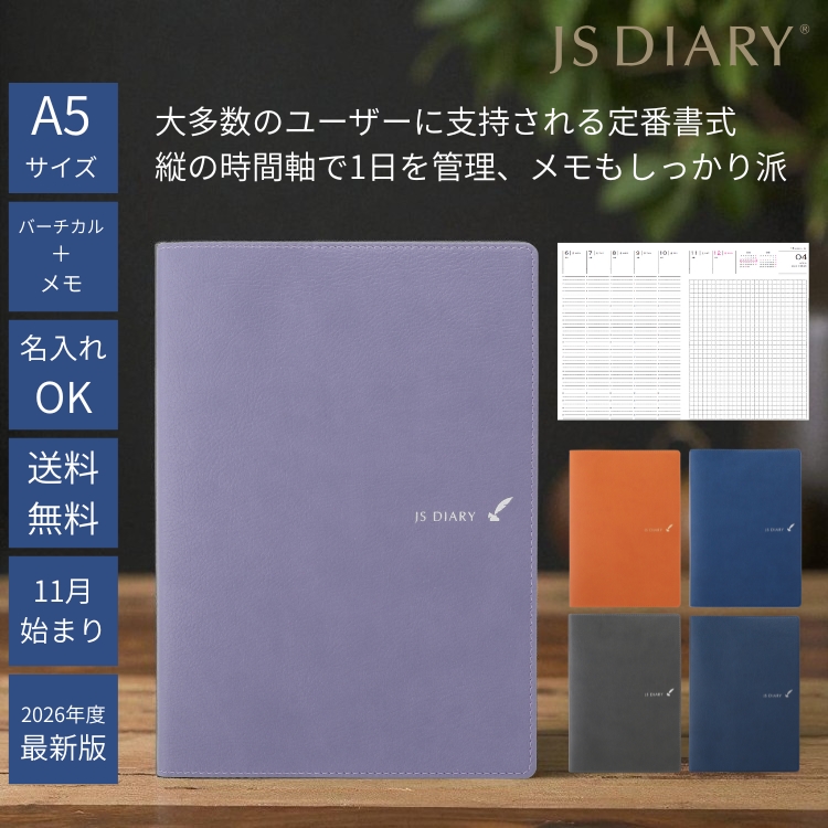 | 【タイプ違い】JSダイアリーA5 | ・2026年 手帳 JSダイアリー A5 見開き1ヶ月+ノート ¥3,300 ・2026年 手帳 JSダイアリー A5 週間 レフト ¥3,300 ・2026年 手帳 JSダイアリー A5 週間 ウィークリーノート ¥3,300 |