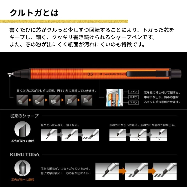 | 関連商品 | ・三菱鉛筆 クルトガ メタル 0.5mm ¥2,750 ・三菱鉛筆 シャープペン クルトガ ウッド KURUTOGA Wood 0.5mm ¥3,850 ・三菱鉛筆 ラミー LAMY サファリ クルトガ インサイド KURUTOGA 0.5mm ¥4,180 ・限定 三菱鉛筆 ユニ メタルケース マットブラック HB 0.5mm ¥2,200 ・限定 クルトガメタル サンライズオレンジ + ユニ メタルケース マットブラック 2点セット 三菱鉛筆 ¥5,000 |