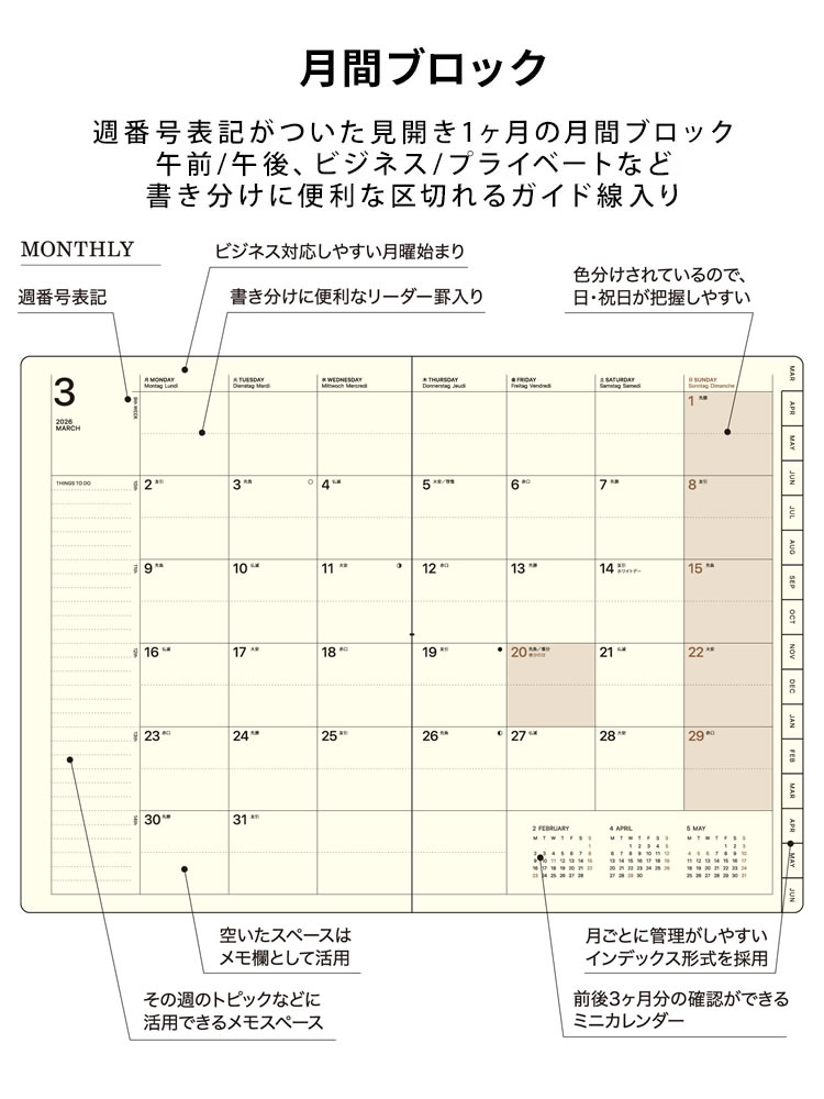 | 使用可能日時 | ・月間ページ:2026年3月〜2027年6月 ・週間ページ:2026年3月1日〜2027年6月30日 ・16か月対応 |