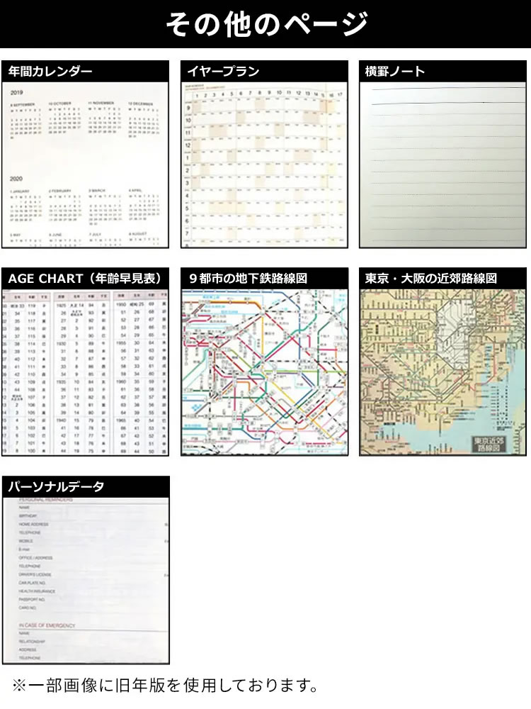 | 仕様 | ・[暦情報] ・月齢表記:満月/新月/上限/下弦 ・週番号表記 ・六曜表記 ・24節季表記 ・祝祭日の日本語表記 ・月曜始まり ・表紙の着脱:可 ・用紙色:クリーム色 ・ペンキャッチャー ・年間カレンダー ・イヤープラン ・ブロックタイプ月間予定表 ・[付属] ・表紙のグル巻きクリアポケット ・見開き1週間ブロックタイプの週間予定表 ・東京、大阪の近郊路線図 ・東京、大阪、名古屋、札幌、仙台、横浜、京都、神戸、福岡の地下鉄路線図 ・年齢早見表 ・パーソナルデータ ・スピン(しおり色違い:2本) |