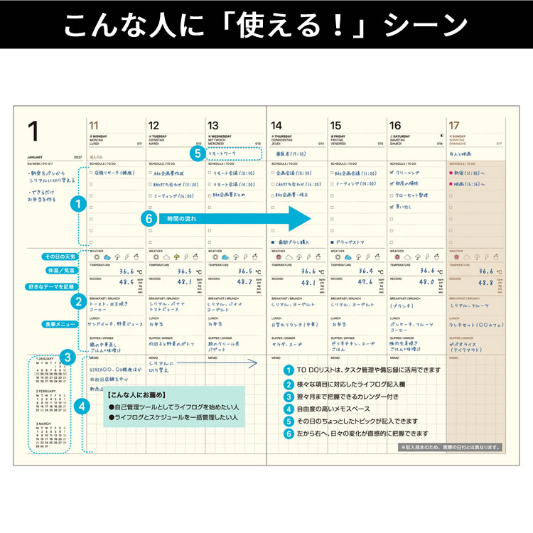 | 使用可能日時 | ・月間ページ:2026年3月〜2027年6月 ・週間ページ:2026年3月1日〜2027年6月30日 |