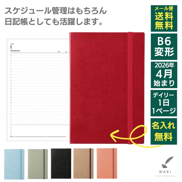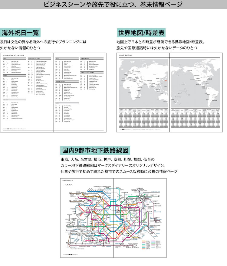 | 仕様 | ・464ページ ・しおり紐2本 ・マンスリーページ:大安・仏滅・友引表示、ムーンカレンダー表示、ウィークナンバー ・デイリーページ:ムーンカレンダー表示、祝日表示(日・米・英・仏・伊・西・独・中国・中国香港・韓国) ・見開きカレンダー(2026/2027/2028年) ・年間カレンダー ・年間プラン ・月間プラン ・罫線メモ(22P)・アドレス(1P)・パーソナルデータ ・海外祝日一覧 (米・英・仏・伊・西・独・中国・香港・韓国) ・世界地図/時差表 ・国内9都市地下鉄路線図 ・平ゴム付 ・PVC製コーナーポケットシール付 ・PP袋入 ・日本製 ・カバー取り外し不可 |