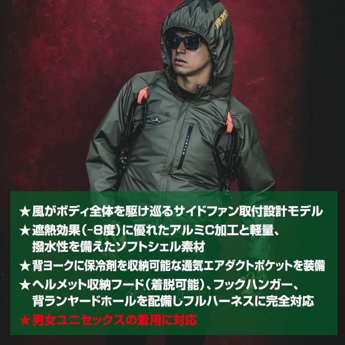 ・ヘルメット収納フード(着脱可能)・フックハンガー・背ランヤードホールを配備しフルハーネスに完全対応