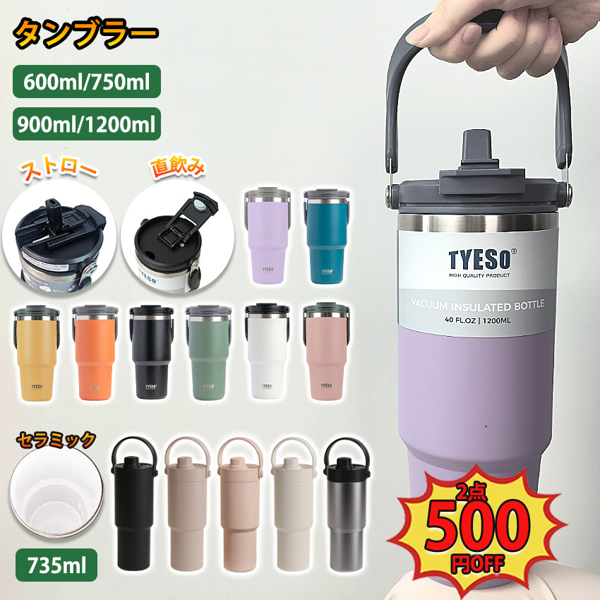 タンブラー 持ち運び ストロー 保温 保冷 蓋付き 水筒 TYESO マグ スポーツ オフィス ジャグ 取っ手 2way コーヒー 304ステンレス 広口
