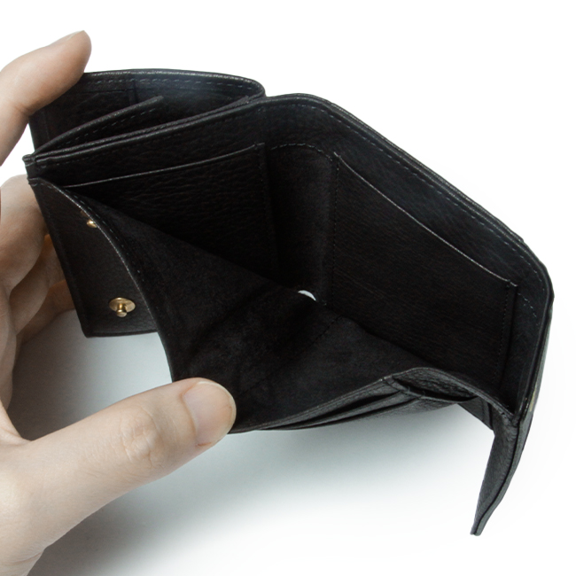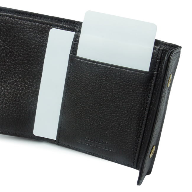 | 商品の特徴 カードポケットの数は全部で4枚分。カードポケット裏側にフリーポケットを備えています。スナップボタンで開く本体開閉口とは別で、ボックス型の広々とした小銭ポケットは外付けになっているのでかさばりにくい構造です。 |