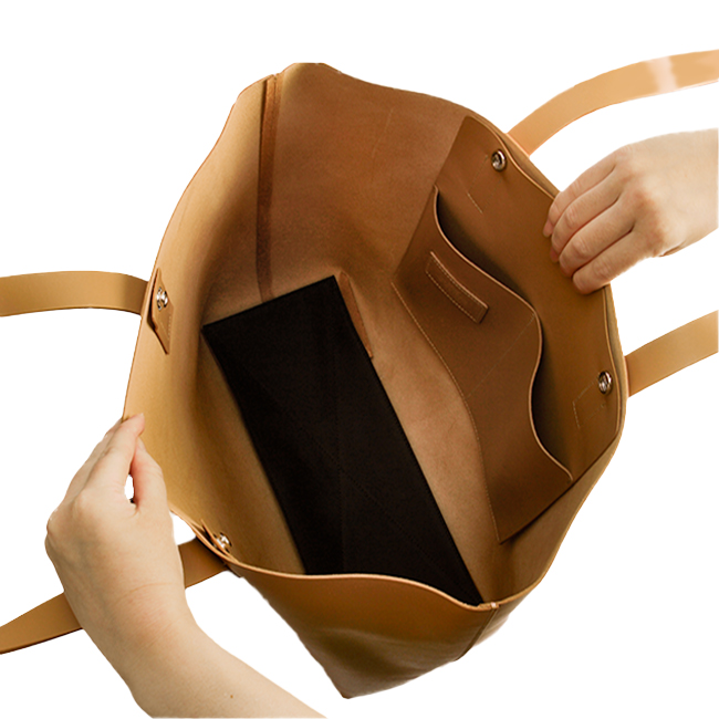バッグ底面はコシがありしっかりとした素材感。自立可能です。