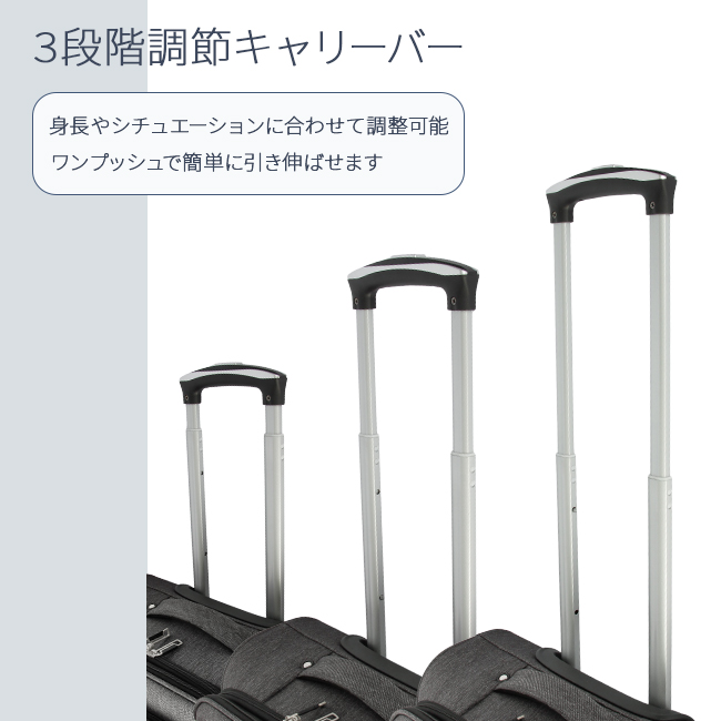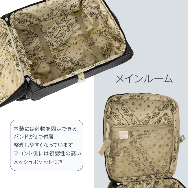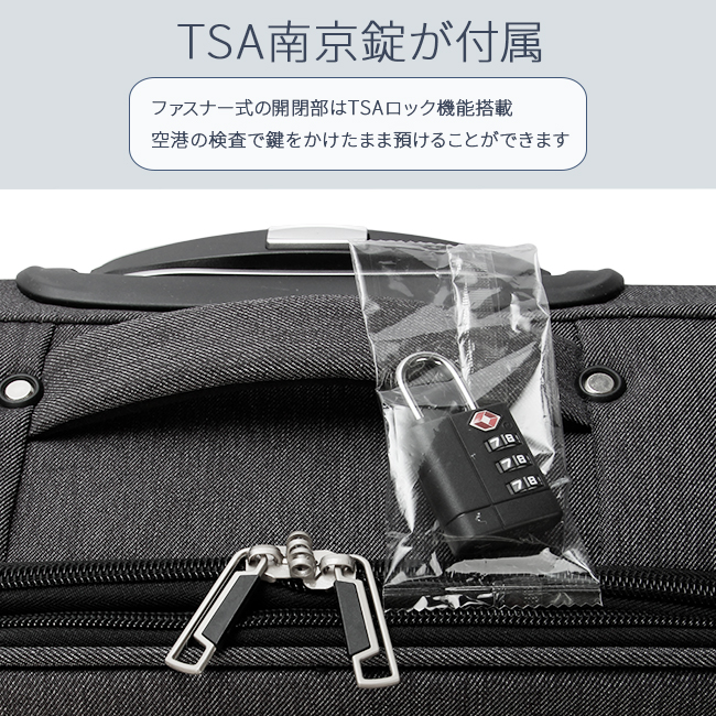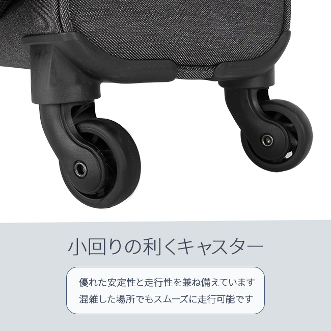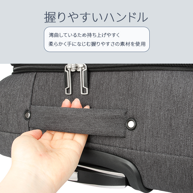 | 大人気アメリカの3大デニムブランドの『Lee』から、デニム調のカジュアルなデザインが魅力のスーツケースが登場! 拡張用ファスナーを開けると最大4cmほどマチ幅が大きくなり約6L容量がUPするので、お土産など荷物が増えたときに便利です。 ファスナー式の開閉部は安心のTSAロック機能搭載! 収納部には、メッシュポケット付き。 内装は、おしゃれなLeeのバンダナ柄。 優れた安定性と走行性を兼ね備えたキャスター(合計4輪)。 小回りが利くので、混雑した場所でもスムーズに走行◎ ワンプッシュで引き伸ばせる伸縮キャリーハンドルは三段階に高さ調節が可能。 また、持ち手は湾曲しているので持ち上げやすく、手になじむ握りやすい素材を使用しました。 ブランドロゴとデニム柄にステッチが入ったデザインがポイント。 シンプルでおしゃれなデザインで年齢・性別問わずに幅広くお使いいただけます。 |