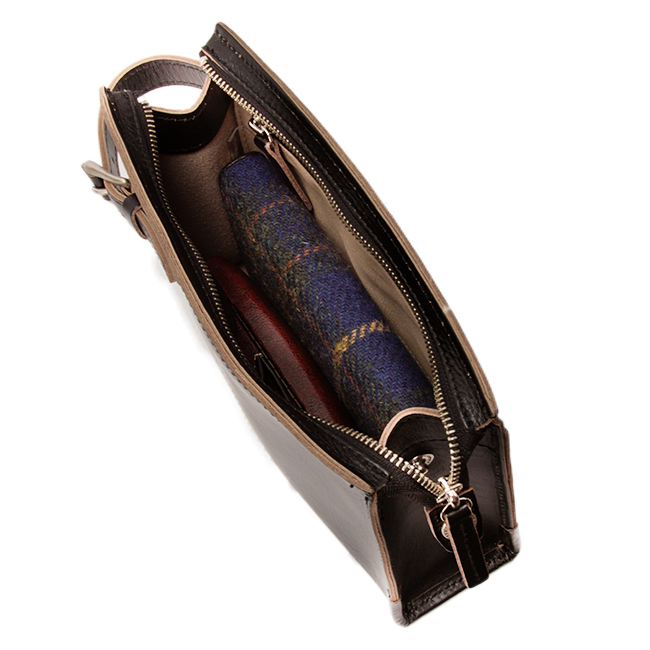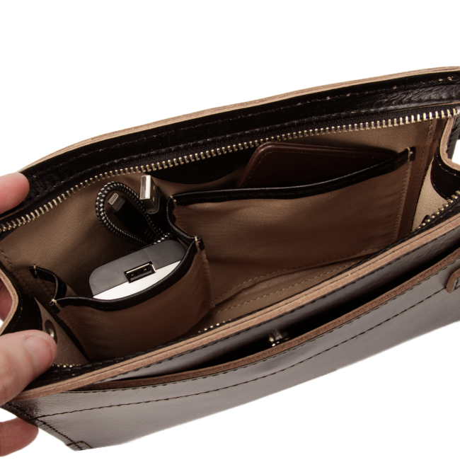 本体はシンプルなスクエア型でマチがしっかりしているため、長財布なども楽々と格納できる安心仕様に。