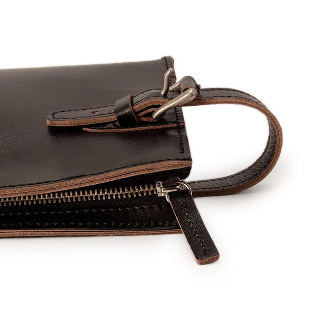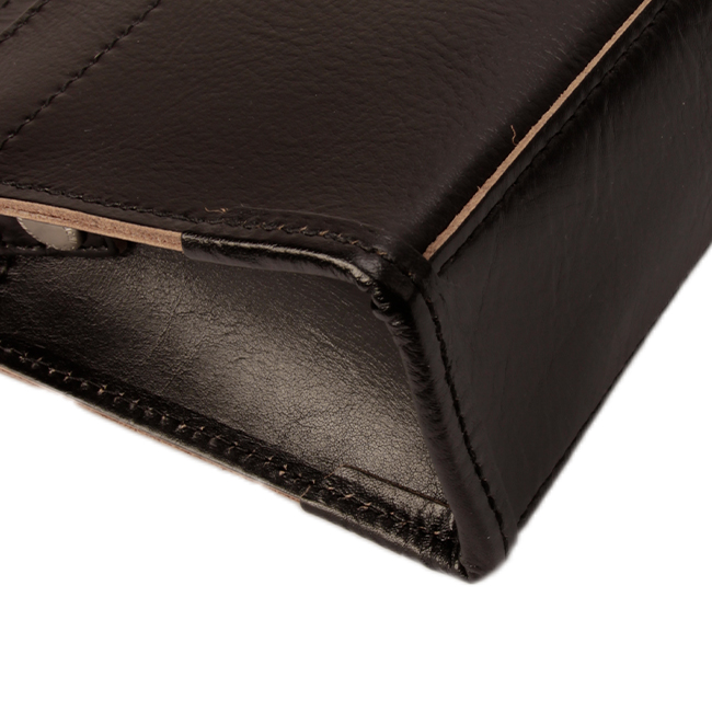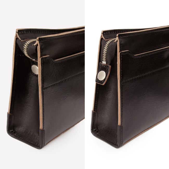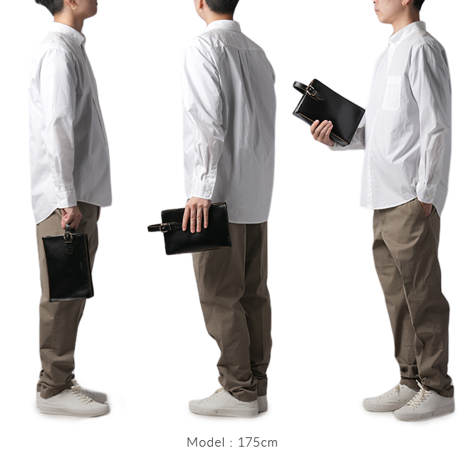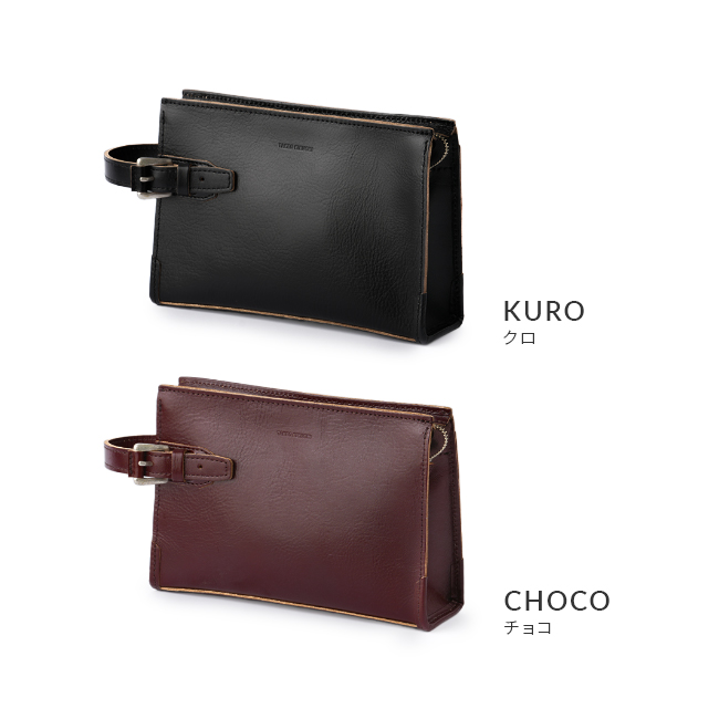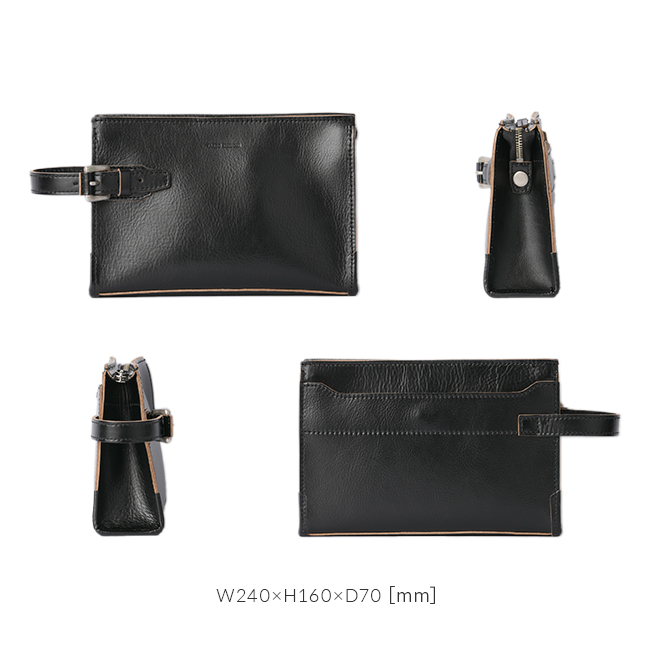 天然皮革ならではの質感を最大限に感じられるよう、エッジの切れ目で仕上げナチュラルな革の色をデザインのポイントとして仕上げました。底のコーナーにあたる部分には、使い込んだ際にヘタリが少ないよう厚めのヘリ巻きを施しており、革職人のこだわりが感じられるタケオキクチらしいこだわりと実用性を両立したクラッチバッグ。