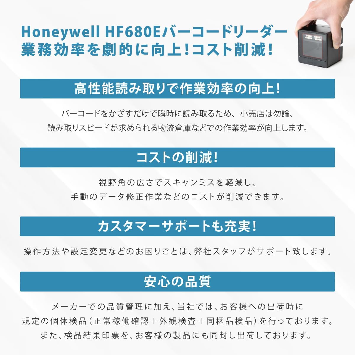 キューブタイプのHF680E・置き型バーコードリーダーのHF680、デリバリーロッカーなどに最適なHF680Mの3機種のラインナップがあります。