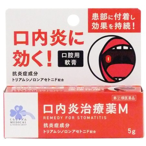 | 医薬品の使用期限 医薬品に関しては特別な表記の無い限り、1年以上の使用期限のものを販売しております。1年以内のものに関しては使用期限を記載します。 名称 口内炎治療薬 内容量 5g 使用方法・用法及び使用上の注意 1日1〜数回、適量を患部に塗布してください。 【使用量の目安】 1患部に、1回約3mm(米粒大)をチューブから取り患部に塗布する。 ●用法・用量に関連する注意 (1)定められた用法・用量を厳守してください。 (2)小児に使用させる場合には、保護者の指導監督のもとに使用させてください。 (3)本剤は口腔用にのみ使用し、口腔用以外には使用しないでください。 (4)痛みが治まったら使用を終了してください。 (5)使用後はしばらく飲食を避けてください。 (6)入れ歯の接着など治療以外の目的に使用しないでください。 【口内炎治療薬Mのつけ方】 (1)よく手を洗い指先を清潔にしましょう。 (2)お口の中をすすいできれいにしてください。 (3)ティッシュペーパーやガーゼなどで軽く押さえるようにして患部のまわりの水分や唾液をぬぐってください。(患部が乾きすぎると口内炎治療薬Mがつきにくくなりますので注意してください) (4)最初にチューブをあけるときは、キャップの反対側のとがった先を使います。指先の水分や唾液をティッシュペーパーやガーゼなどで拭き取り、チューブから約3mm(米粒大)の口内炎治療薬Mを指先にとります。 (5)鏡などをみて患部のまわりからおおうようにつけます。つけた後、舌でさぐらないようにし、しばらくは食べもの・飲みものをひかえましょう。(食後やおやすみ前がよいでしょう) (6)チューブの口やその周辺に付着した口内炎治療薬Mをティッシュペーパーやガーゼなどできれいに拭き取ったあと、キャップをしっかり閉めてください。(水分や唾液の影響で口内炎治療薬Mが固まることがあります) ●してはいけないこと (守らないと現在の症状が悪化したり、副作用がおこりやすくなります) 1.次の人は使用しないでください (1)感染性の口内炎が疑われる人。(医師、歯科医師、薬剤師又は登録販売者にご相談ください) ガーゼなどで擦ると容易に剥がすことのできる白斑が口腔内全体に広がっている人。(カンジダ感染症が疑われる) 患部に黄色い膿がある人。(細菌感染症が疑われる) 口腔内に米粒大〜小豆大の小水疱が多発している人、口腔粘膜以外の口唇、皮膚にも水疱、発疹がある人。(ウイルス感染症が疑われる) 発熱、食欲不振、全身倦怠感、リンパ節の腫脹などの全身症状がみられる人。(ウイルス感染症が疑われる) (2)口腔内に感染を伴っている人。(ステロイド剤の使用により感染症が悪化したとの報告があることから、歯槽膿漏、歯肉炎等の口腔内感染がある場合には使用しないでください) (3)5日間使用しても症状の改善がみられない人。 (4)1〜2日間使用して症状の悪化がみられる人。 ●相談すること 1.次の人は使用前に医師、歯科医師、薬剤師又は登録販売者にご相談ください (1)医師又は歯科医師の治療を受けている人。 (2)薬などによりアレルギー症状を起こしたことのある人。 (3)妊婦又は妊娠していると思われる人。 (4)授乳中の人。 (5)患部が広範囲にある人。 (6)高齢者。 2.使用後、次の症状があらわれた場合は副作用の可能性がありますので、直ちに使用を中止し、この文書を持って医師、歯科医師、薬剤師又は登録販売者にご相談ください 使用後、次の症状があらわれた場合 [関係部位:症状] 口腔内:白斑(カンジダ感染症が疑われる)、患部に黄色い膿(細菌感染症が疑われる)、味覚の異常、しびれ感 その他:アレルギー症状(発疹・発赤、かゆみ、浮腫等) 3.本剤使用後、次の症状があらわれた場合には、感染症による口内炎や他疾患による口内炎が疑われるので使用を中止し、医師、歯科医師、薬剤師又は登録販売者にご相談ください 発熱、食欲不振、全身倦怠感、リンパ節の腫脹、水疱(口腔内以外)、発疹・発赤、かゆみ、口腔内の患部が広範囲に広がる、目の痛み、かすみ目、外陰部潰瘍 効能・効果 口内炎(アフタ性) 本剤が対象とする「口内炎(アフタ性)」は、頬の内側や舌、唇の裏側などに、周りが赤っぽく、中央部が浅くくぼんだ白っぽい円形の痛みを伴う浅い小さな潰瘍(直径10mm未満)が1〜数個できた炎症の総称です。 成分・分量 100g中 成分・・・分量・・・はたらき トリアムシノロンアセトニド・・・100mg・・・患部の炎症を鎮め、口内炎を改善します。 添加物として、ゲル化炭化水素、カルメロースナトリウム、サッカリンナトリウム水和物、香料を含有します。 保管および取扱い上の注意 (1)直射日光の当たらない涼しいところに密栓して保管してください。 (2)小児の手の届かないところに保管してください。 (3)他の容器に入れ替えないでください。(誤用の原因になったり、品質が変わる場合があります) (4)使用期限を過ぎた製品は使用しないでください。使用期限内であっても、品質保持の点から開封後はなるべく早く使用してください。 (5)使