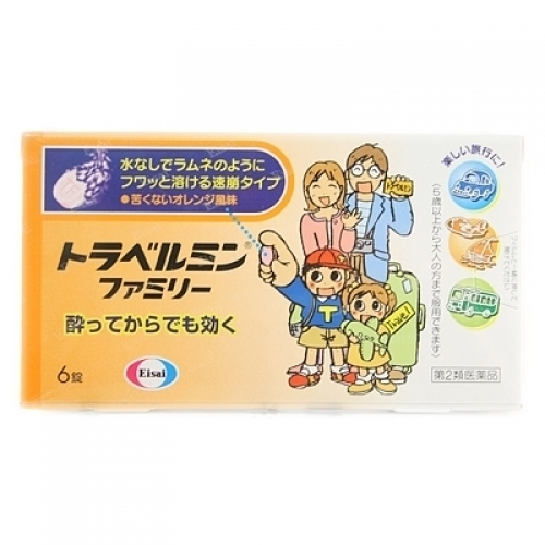トラベルミン ファミリーは,乗りもの酔い症状の予防及び緩和に有効な乗りもの酔い薬です。 ラムネのようにフワッと溶ける速崩タイプなので,旅行中のバスや電車などの移動中でも水なしで服用できます。また,酔ってからでも効く成分を配合しているので,旅行を楽しんでいただけます。 トラベルミン ファミリーひとつで,5才以上のお子様から大人の方まで服用いただけます。 |