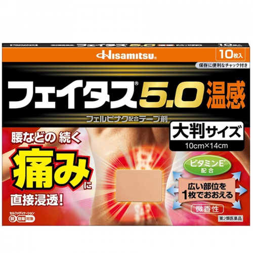 | 効きめ成分フェルビナクを5.0%配合した,経皮鎮痛消炎テープ剤。 肩・腰・関節・筋肉の痛みに優れた効きめをあらわします。 ビタミンE配合により,患部の血行を促進します。 ノニル酸ワニリルアミドのはたらきで,心地よい温感作用をあらわします。 微香性なので,就寝時や人前でも気になりません。 全方向伸縮で,肌にピッタリフィットします。 腰などの広い部位を一枚でおおえる,大判サイズ。 |