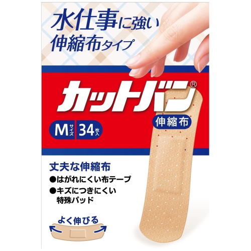| 合成ゴム系粘着剤を塗布した伸縮布粘着テープとベンザルコニウム塩化物薬液で消毒したポリオレフィンネット付き不織布パッドからなる救急絆創膏です。 |