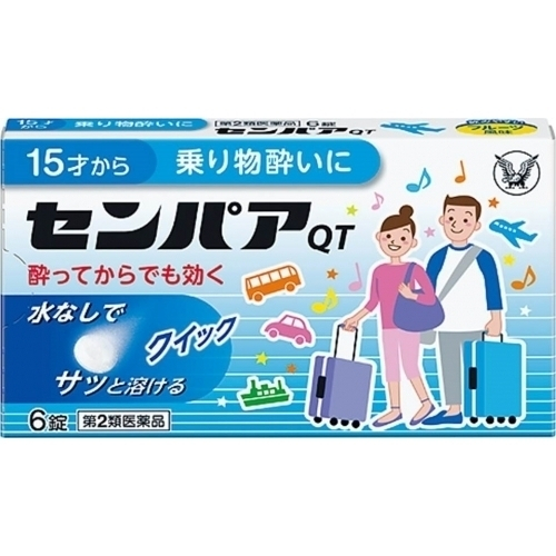 センパア・QTは,水なしでかまずにすばやく溶けるタイプの乗物酔い止め薬です。 乗物酔いによるめまい・吐き気・頭痛の症状を予防・緩和します。 気分が悪くなってからでもすぐに服用すれば,めまい・吐き気・頭痛をしずめます。 |