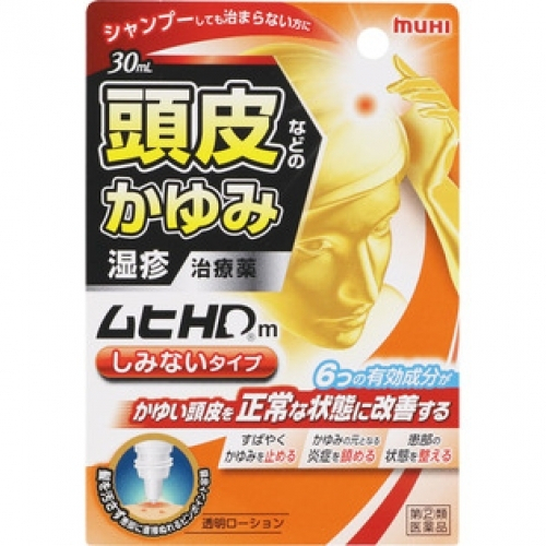 | しみないタイプ 6つの有効成分が炎症をともなうかゆい頭皮を正常な状態に改善します すばやくかゆみを止める (1)ジフェンヒドラミン塩酸塩(かゆみ止め成分) (2)l-メントール(清涼感成分) かゆみの元となる炎症を鎮める (3)プレドニゾロン吉草酸エステル酢酸エステル(PVA)(抗炎症成分) 患部の状態を整える (4)イソプロピルメチルフェノール(殺菌成分) (5)アラントイン(荒れた頭皮の修復を助ける成分) (6)パンテノール(荒れた頭皮の修復を助ける成分) ■PVAは,一般用医薬品では効果の高いランクに分類されるステロイド成分です。患部ですぐれた抗炎症作用を発揮し,その後,低活性物質に変化します。このような特性をアンテドラッグと呼びます。PVAは有効性と安全性のバランスの良い成分です。 頭皮の患部に塗りやすい!こだわり設計! ・患部に直接ピンポイントで塗れるので,手や髪の毛を汚さずしっかり塗布することができます。 ・べたつかないサラッとした透明ローションです。頭皮につけた時に目や耳にたれにくいよう適度な粘度を持たせています。 ●さらに!「ムヒHDm しみないタイプ」ならではの2つのこだわり (1)知覚刺激成分の配合を抑えることで「しみない・やさしい使い心地」を実現しました(エタノール無配合)。 (2)薬が塗れた事がわかる程度の「ほんのりやさしい清涼感」になっています。 ☆ついつい頭皮を掻きむしったり頭皮が荒れている時に,頭皮のかゆみ止め薬が「しみて痛い」「強いクール感が不快」と感じて“薬を塗れない・治療を続けられない”という方や,やさしい使い心地を好まれるお子さまにもお使いいただけます。 |