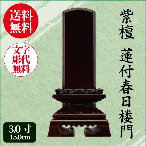 位牌 紫檀 蓮付春日楼門 3.0寸(15.0cm) 唐木位牌 送料無料 1霊分名入れ無料 仏具
