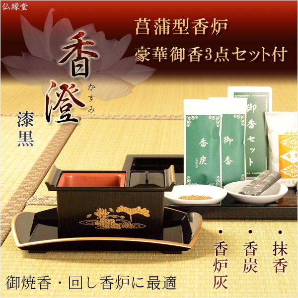 菖蒲型香炉【お焼香セット:香澄(かすみ)漆黒 豪華御香3点セット付】回し香炉 送料無料