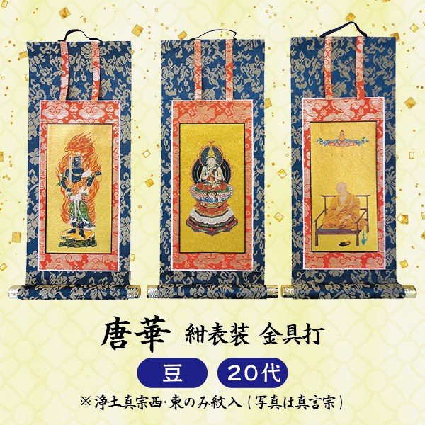 【数量1=本尊・数量2=両脇掛・数量3=本尊+両脇掛 / ご注文数量で選べる3パターン】掛軸 唐華 紺表装 豆 20代
