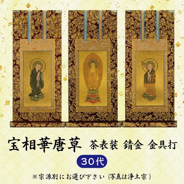 【数量1=本尊・数量2=両脇掛・数量3=本尊+両脇掛 / ご注文数量で選べる3パターン】掛軸 上宝相華唐草 茶表装 錆金金本紙 30代 京都西陣織金襴