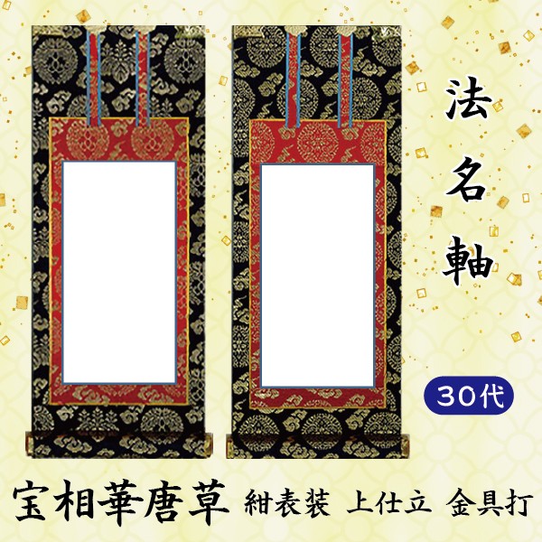 【法名軸30代】[30代=高26×軸巾12.5cm]掛軸 上宝相華唐草 紺表装 上仕立金本紙 金具打 30代 京都西陣織金襴使用 日本製 仏壇用