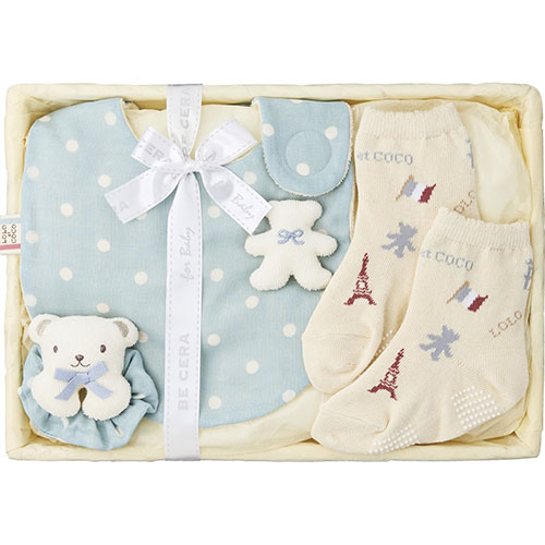 セット内容 : クマモチーフ付スタイ・ソックス(11〜13cm)・リストガラガラ・竹籠(20×29.5×7cm)×各1
