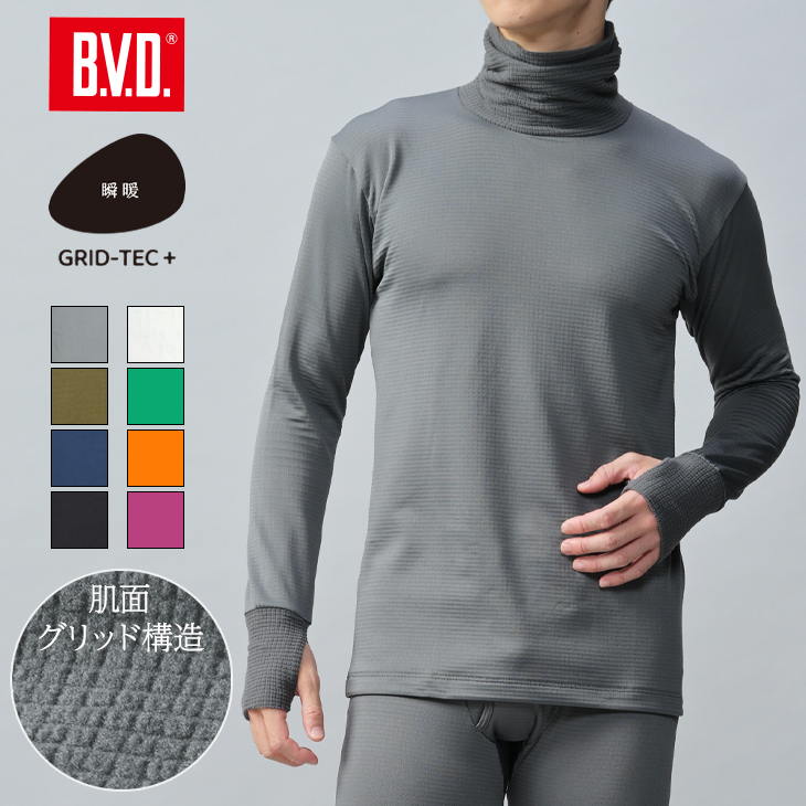 あったかインナー BVD 瞬暖GRID-TEC+ グリッドテック 裏起毛 サムホールタートルネック長袖Tシャツ M L LL 防寒 bvd インナー メンズ 暖か 冬 アウトドア 釣り