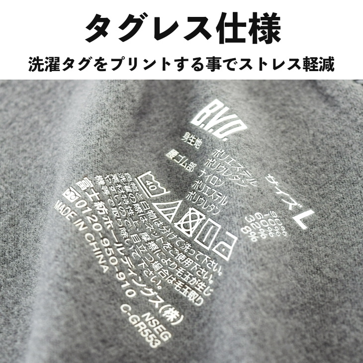 『タグレス』ブランドタグや洗濯ネームが肌に当たるストレスをなくすために転写プリントを採用。