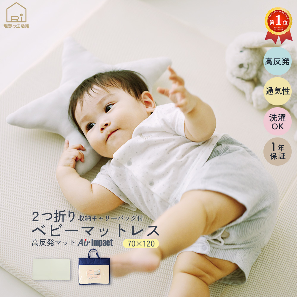 | 「Air impact -エアインパクト-」 ベビー用マットレスは通気性が良く、さらにダニも住みづらい構造なのでアレルギーを気にしているお客様から“安心して使える”とご好評を頂いております。 汗をかきやすい赤ちゃんでも、蒸れずにぐっすり眠りやすいのはもちろん! うつ伏せになっても呼吸がしやすいので、ママとパパも安心! 持ち運びに便利なキャリーケースも付いているので、保育園や幼稚園、帰省やお出かけにも持ち運びできるのも嬉しいポイントです! ファスナーで手軽に脱着可能なカバーは、通気性のいいメッシュ素材を使用し、汚れたらお洗濯もして頂けます。 中材も水でジャブジャブ丸洗いして頂けるので、いつでも清潔にお使い頂けます。 エアインパクトは『3次元スプリング構造』と呼ばれる特殊構造により、柔軟性のあるプラスティック樹脂で弾力効果を発揮できる繊維形状に保ちながら、空気を含むように絡ませています。 これにより適度な硬さと、優れた通気性を生み出し理想的な寝姿勢を促します。 エアインパクトは湿気がこもらない抜群の通気性を誇り、寝汗がマットレスにこもらず年間を通して同じ寝心地を維持します。 耐久性にも優れ8万回の圧縮テストをしても96%の復元率を維持します。 さらに、ホルマリン検査では数値が検出されず安心が証明されております。 |