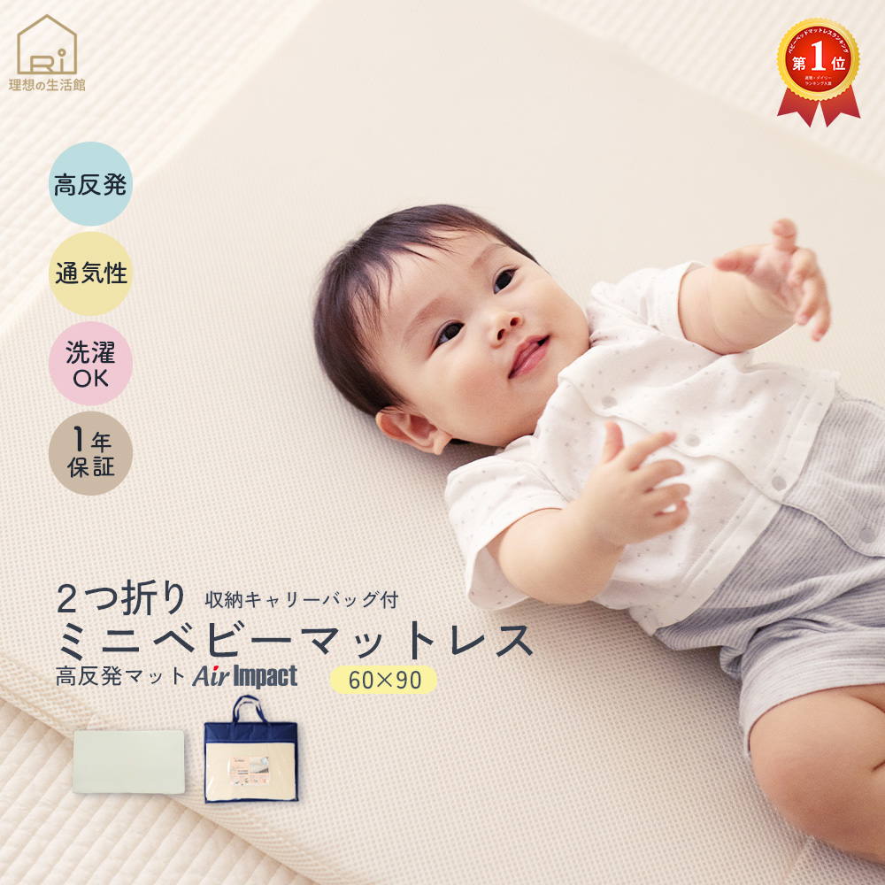 | 「Air impact -エアインパクト-」 ベビー用マットレスは通気性が良く、さらにダニも住みづらい構造なのでアレルギーを気にしているお客様から“安心して使える”とご好評を頂いております。 汗をかきやすい赤ちゃんでも、蒸れずにぐっすり眠りやすいのはもちろん! うつ伏せになっても呼吸がしやすいので、ママとパパも安心! 持ち運びに便利なキャリーケースも付いているので、保育園や幼稚園、帰省やお出かけにも持ち運びできるのも嬉しいポイントです! ファスナーで手軽に脱着可能なカバーは、通気性のいいメッシュ素材を使用し、汚れたらお洗濯もして頂けます。 中材も水でジャブジャブ丸洗いして頂けるので、いつでも清潔にお使い頂けます。 エアインパクトは『3次元スプリング構造』と呼ばれる特殊構造により、柔軟性のあるプラスティック樹脂で弾力効果を発揮できる繊維形状に保ちながら、空気を含むように絡ませています。 これにより適度な硬さと、優れた通気性を生み出し理想的な寝姿勢を促します。 エアインパクトは湿気がこもらない抜群の通気性を誇り、寝汗がマットレスにこもらず年間を通して同じ寝心地を維持します。 耐久性にも優れ8万回の圧縮テストをしても96%の復元率を維持します。 さらに、ホルマリン検査では数値が検出されず安心が証明されております。 |