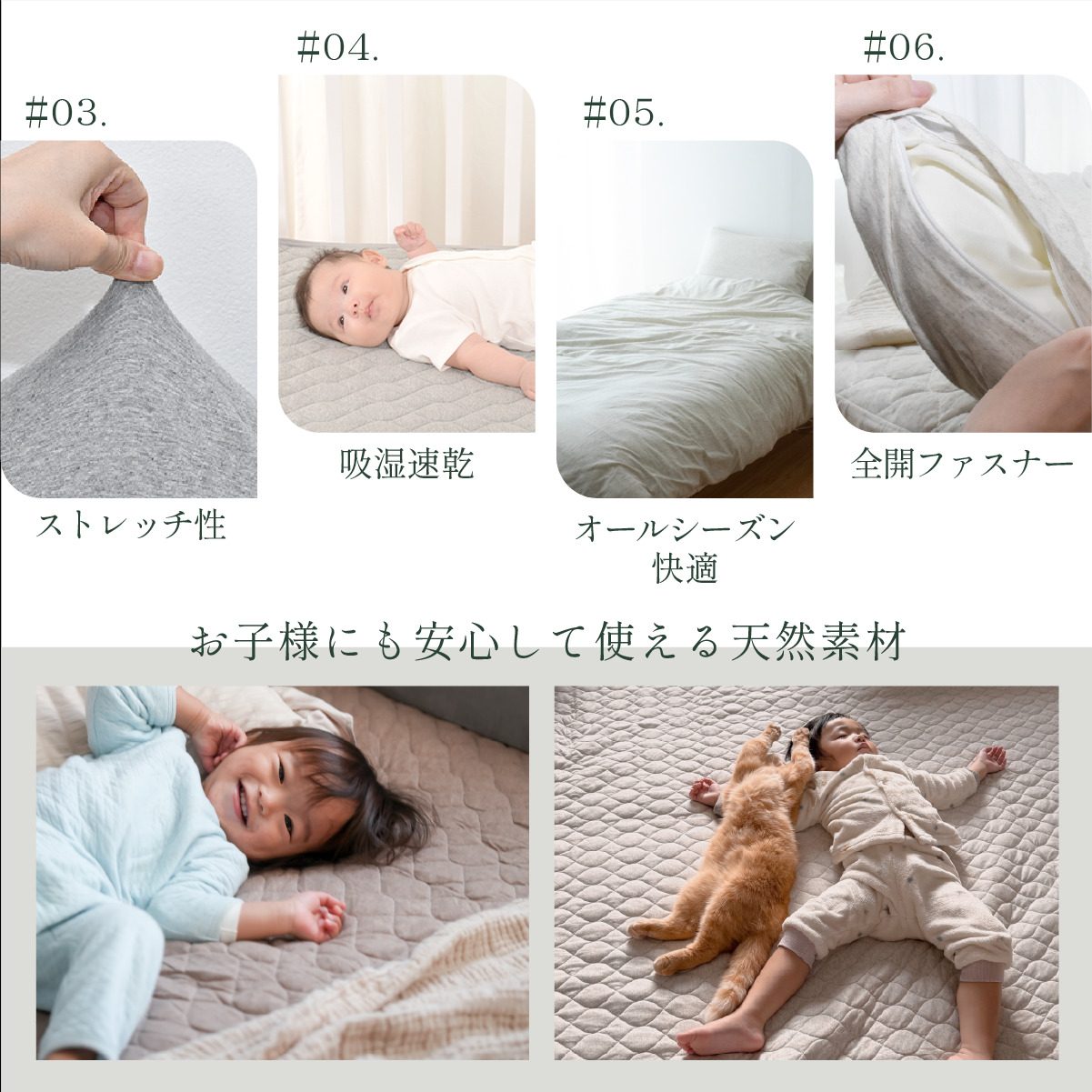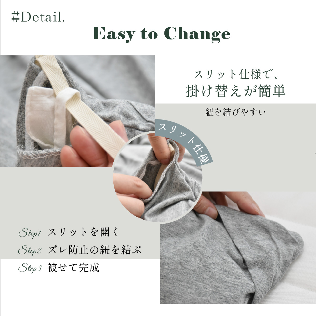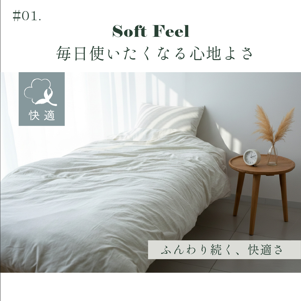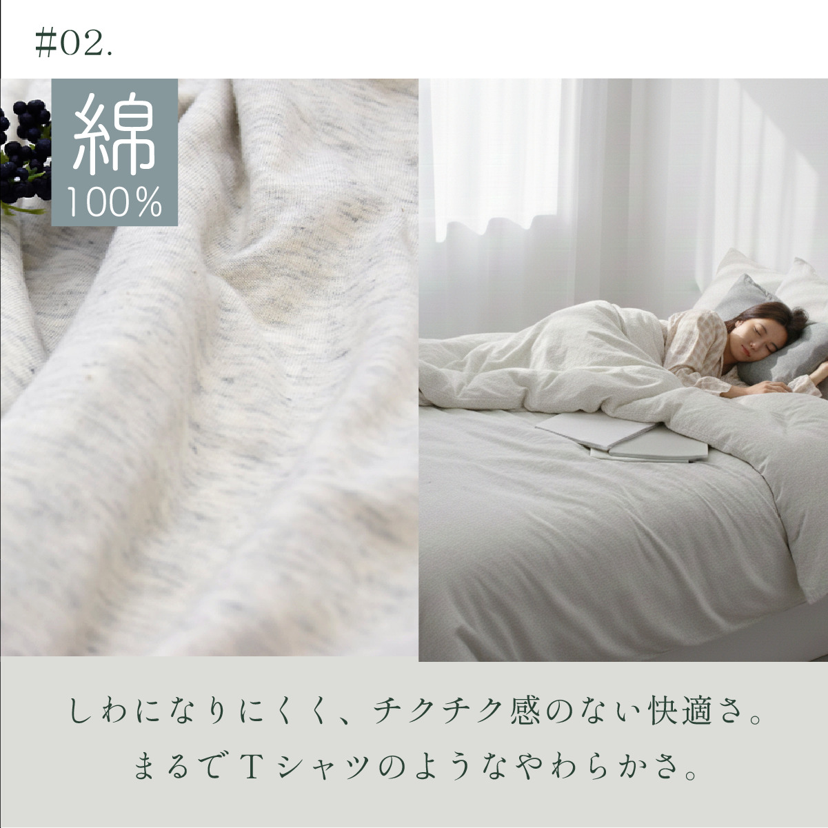 | ■身体に寄り添う、抜群のストレッチ性 お気に入りのカットソーのように身体に寄り添ってフィットする気持ちよさ。 ソフトで抜群のストレッチ性があるニット織り生地。 ■寝汗をしっかり吸収、ムレにくい しっかり汗を吸収して、ムレにくい。吸放湿性にすぐれた綿100%素材。睡眠中の汗をしっかり吸収してくれる。 ■使うほどやわらかく肌に馴染むやさしさ 使うほどやわらかく肌に馴染むやさしさ。 肌着と同じように使えば使うほど、肌に馴染んでやさしいふんわり感。 |