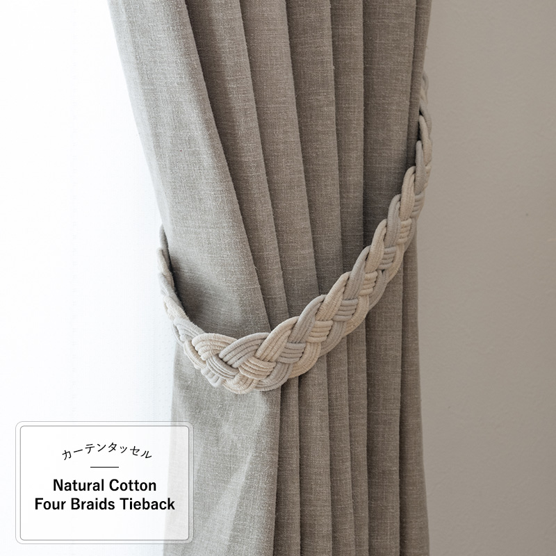 コットン100%の生成り糸のナチュラルなカーテンタッセル。淡いブルーに染めた糸と生成り糸を4つ編みしたシンプルなタイバック。ナチュラルな風合いはリネンカーテンやコットンカーテンにおすすめ。全長90と長めなので、タワーマンションや商業ビルなどの幅広で大きなカーテンも留めることができます。厚地カーテンには共布の舟形タッセルが付属していますが、タッセルにこだわるとインテリアにぐっとこなれ感が出ておしゃれになります。