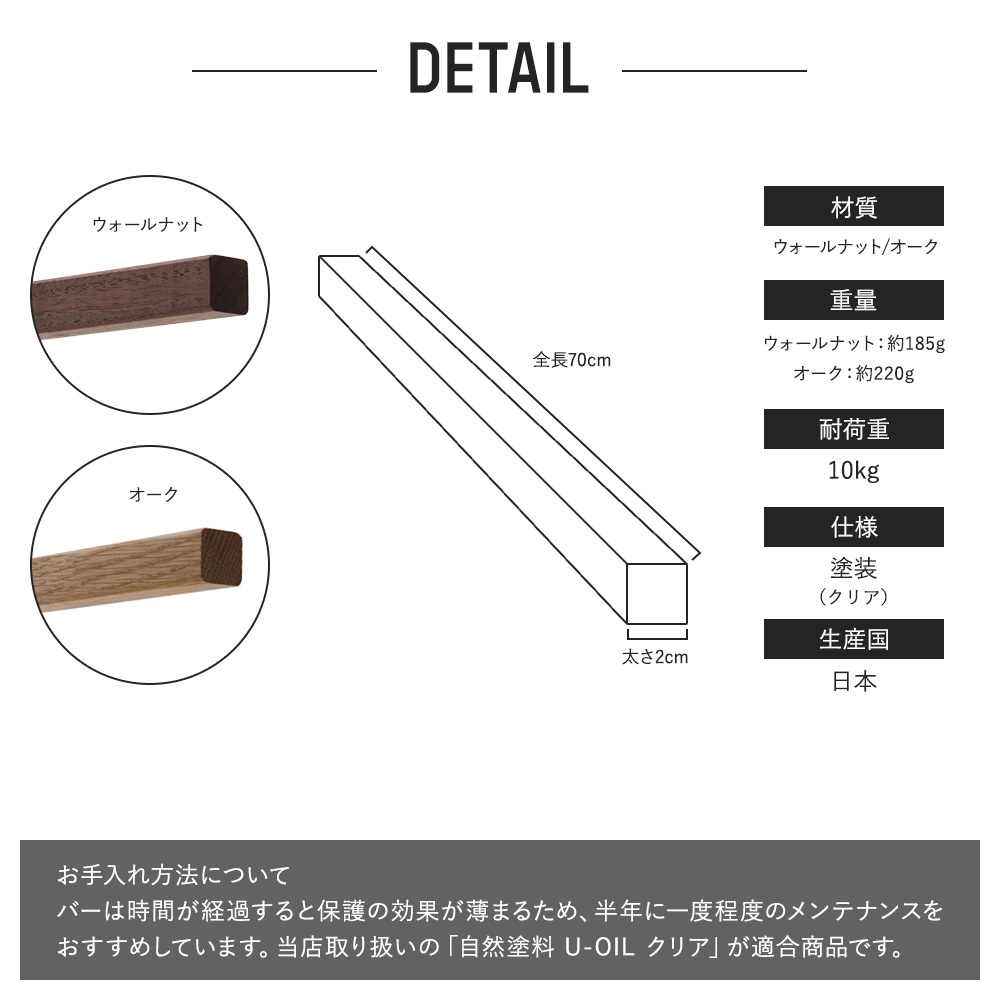 | ■商品名 by TOMOYASU S.S. アイアンハンガーバー ten・ki 専用バー S ■サイズ 全長70cm、太さ2cm ■重量 ウォールナット約185g 、オーク約220g ■耐荷重 10kg ■材質 ウォールナット/オーク ■仕様 塗装(クリア) ■生産国 日本 ■保証 3年保証対象 |