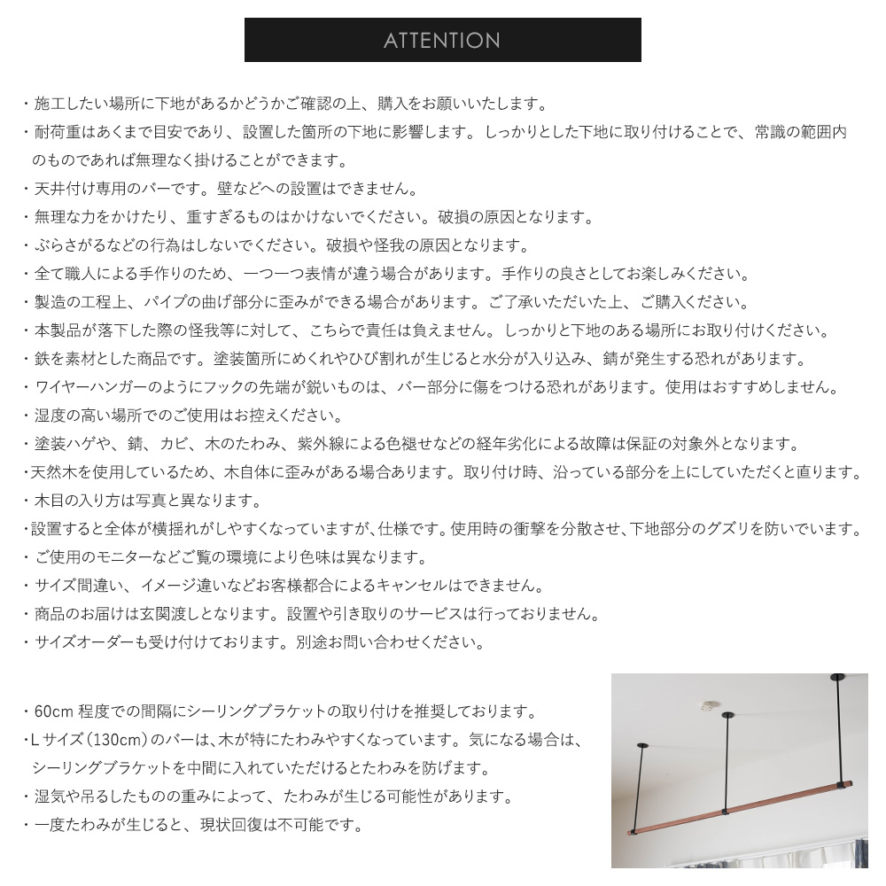 | ・施工したい場所に下地があるかどうかご確認の上、購入をお願いいたします。 ・TEKKICRAFT ten・ki専用商品です。他商品には取り付けられません。 ・耐荷重はあくまで目安であり、設置した箇所の下地に影響します。しっかりとした下地に取り付けることで、常識の範囲内のものであれば無理なく掛けることができます。 ・天井付け専用のバーです。壁などへの設置はできません。 ・無理な力をかけたり、重すぎるものはかけないでください。破損の原因となります。 ・ぶらさがるなどの行為はしないでください。破損や怪我の原因となります。 ・全て職人による手作りのため、一つ一つ表情が違う場合があります。手作りの良さとしてお楽しみください。 ・製造の工程上、パイプの曲げ部分に歪みができる場合があります。ご了承いただいた上、ご購入ください。 ・本製品が落下した際の怪我等に対して、こちらで責任は負えません。しっかりと下地のある場所にお取り付けください。 ・バーをブラケットへ取り付ける際、木割れの発生を防ぐため下穴を開けてから取り付けるようお願いいたします。 ・鉄を素材とした商品です。塗装箇所にめくれやひび割れが生じると水分が入り込み、錆が発生する恐れがあります。 ・ワイヤーハンガーのようにフックの先端が鋭いものは、バー部分に傷をつける恐れがあります。使用はおすすめしません。 ・湿度の高い場所でのご使用はお控えください。 ・塗装ハゲや、錆、カビ、木のたわみ、紫外線による色褪せなどの経年劣化による故障は保証の対象外となります。 ・天然木を使用しているため、木自体に歪みがある場合あります。取り付け時、沿っている部分を上にしていただくと直ります。 ・木目の入り方は写真と異なります。 ・設置すると全体が横揺れがしやすくなっていますが、仕様です。使用時の衝撃を分散させ、下地部分のグズリを防いでいます。 ・湿気や吊るしたものの重みによって、たわみが生じる可能性があります。 ・60cm程度での間隔にシーリングブラケットの取り付けを推奨しております。 ・Lサイズ(130cm)のバーは、木が特にたわみやすくなっています。気になる場合は、シーリングブラケットを中間に入れていただけるとたわみを防げます。 ・一度たわみが生じると、現状回復は不可能です。 ・ご使用のモニターなどご覧の環境により色味は異なります。 ・サイズ間違い、イメージ違いなどお客様都合によるキャンセルはできません。 ・商品のお届けは玄関渡しとなります。設置や引き取りのサービスは行っておりません。 ・サイズオーダーも受け付けております。別途お問い合わせください。 ※ブランドリニューアルに伴い、刻印デザインが旧・新両バージョンで混在する場合があります。旧刻印「TEKKI CRAFT」 新刻印「by TOMOYASU S.S.」 |