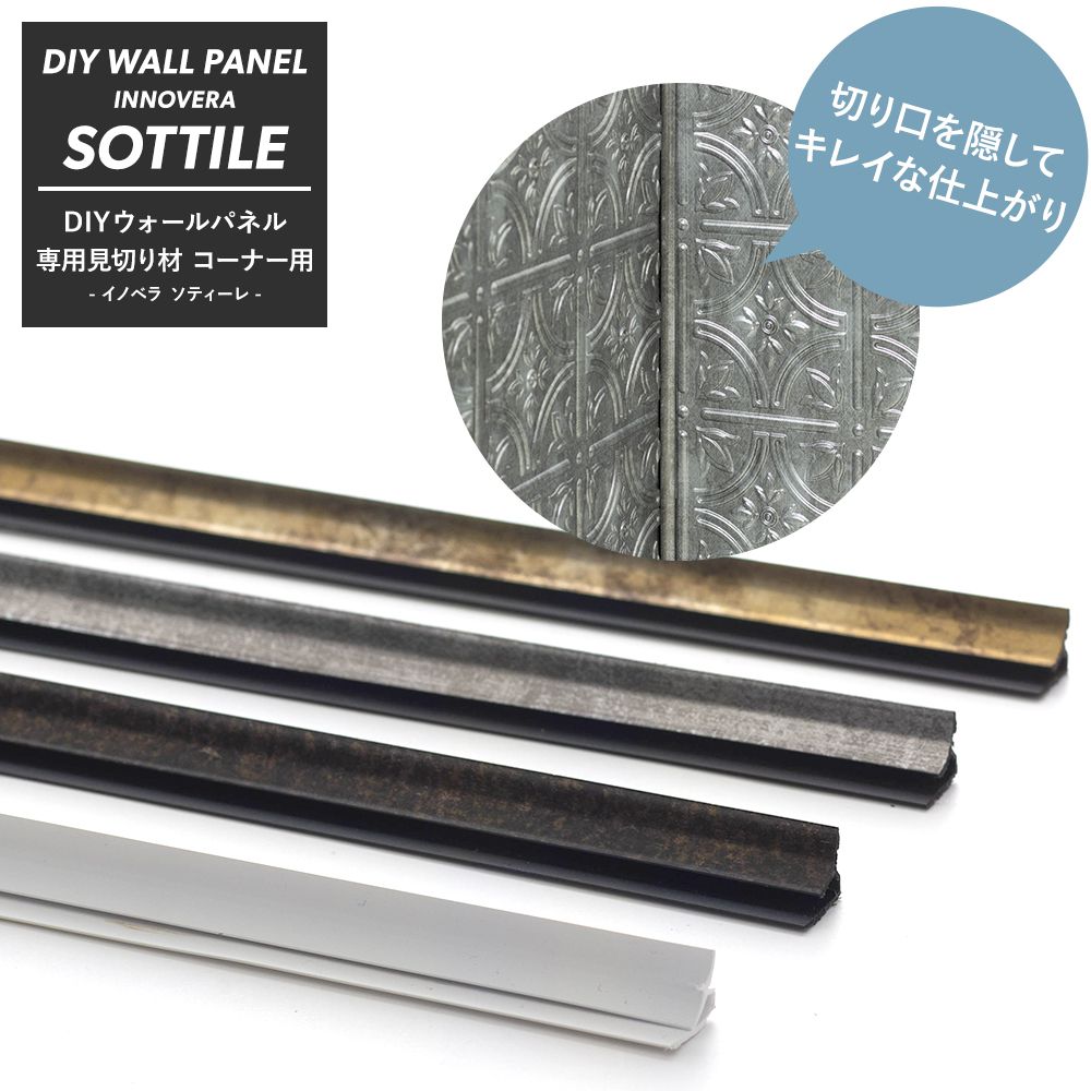 | 壁に貼る装飾パネル「イノベラ ソティーレシリーズ」専用見切り材です。 こちらの商品は部屋の角に使用する「コーナー用」の見切り材です。 側面や切り口を隠し、仕上げを綺麗に見せることができます。 本体パネルと同じようにカッターやハサミでカットすることができます。 |