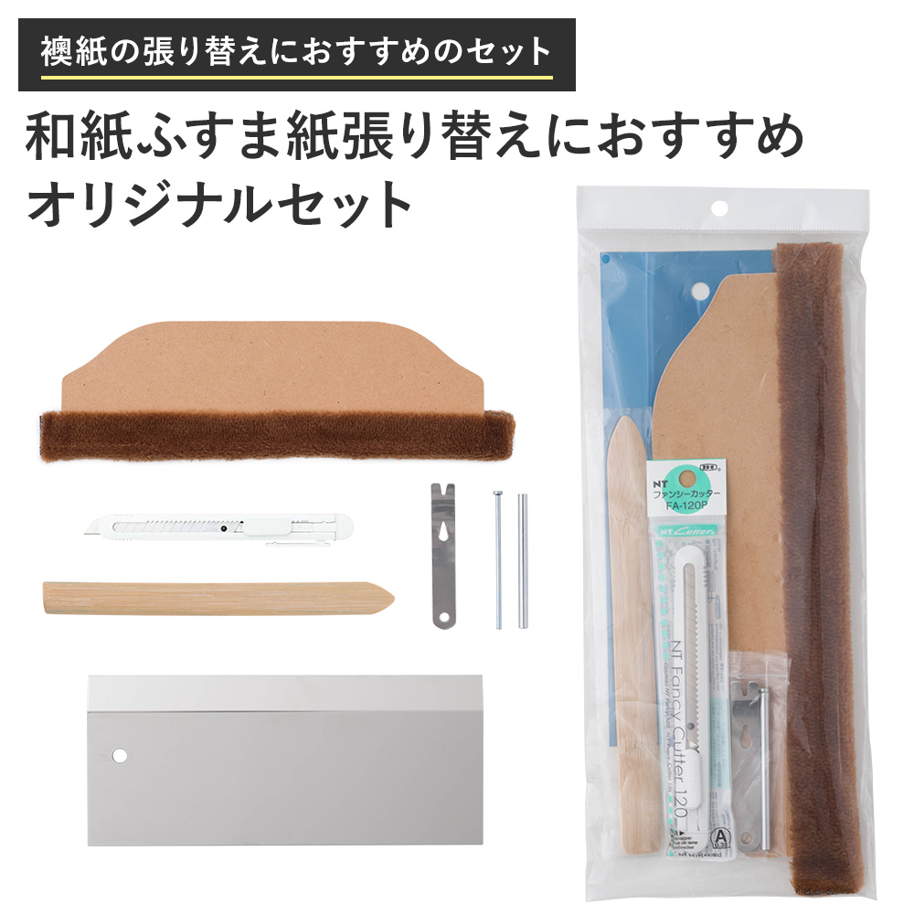 | ■商品名 和紙ふすま紙張り替えにおすすめオリジナルセット ■セット内容(サイズ・重量・材質) カッターナイフ:137mm×15mm・約15g・ABS樹脂、SK材 竹ベラ:約18mm×195mm・約9g・竹 ミニバール:77mm×12mm・約17g・ステンレス鋼 引手釘打ち:Φ5mm×72mm・約10・ステンレス鋼 カッターガイド:220mm×95mm・約91g・ステンレス鋼 簡易ベロアブラシ:288mm×82mm・67g・アクリル、MDF |