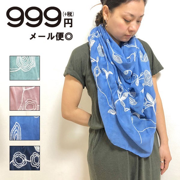 バラの花とつぼみのラインモチーフ刺繍が大人かわいい大判ストールです♪