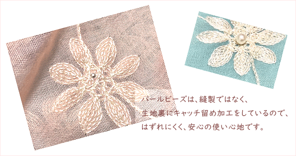 ※パールビーズは、縫製ではなく、生地裏にキャッチ留め加工をしているので、はずれにくく、安心の使い心地です。