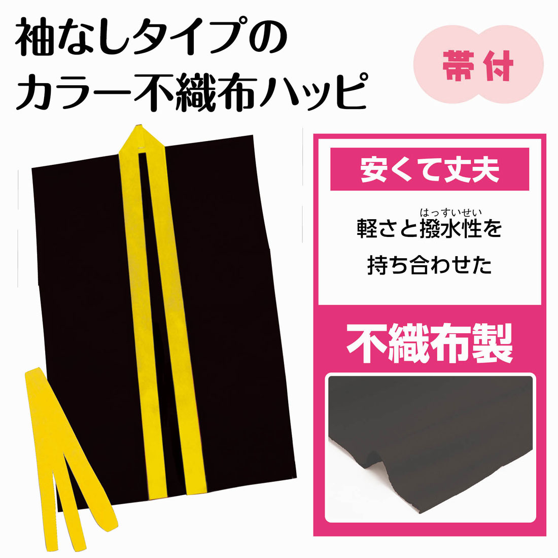 | 商品名 | 不織布ハッピ ブラック 袖無 不織布 黒 ハッピ 黄襟 法被 半被 半纏 舞台衣装 衣装 運動会 ユニセックス 体育祭 発表会 スポーツ大会 お遊戯会 応援 祭り イベント ダンス エイサー よさこい 装飾 幼児 幼稚園 保育園 |