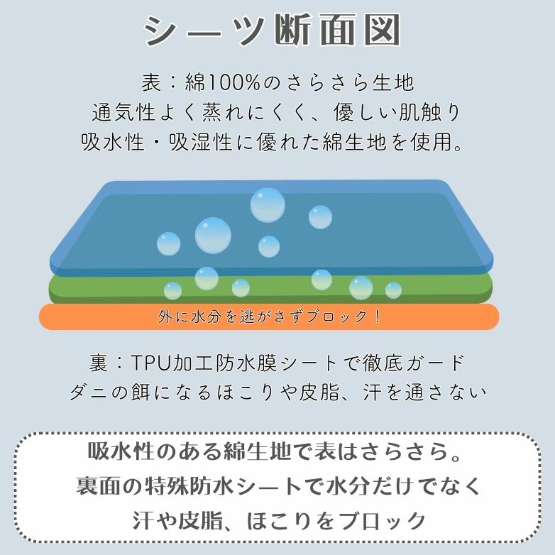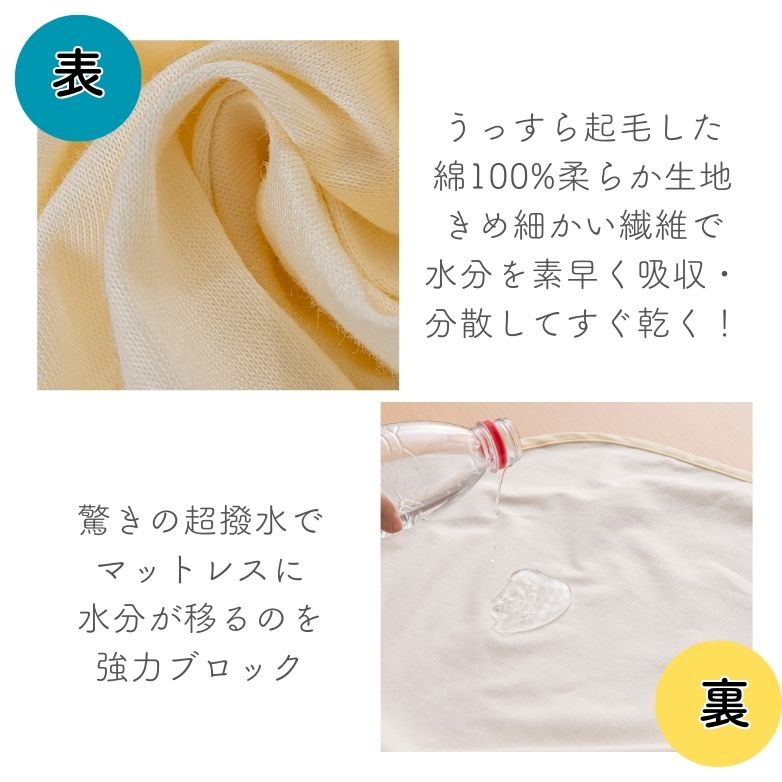 | 商品説明 | 綿100%,特殊ラミネートフィルムでしっかり防水の頼れる1枚 おねしょシーツ コットン100%の優しい肌触りで,お子さまも安心して使える防水シーツ 防水加工を施した肌触りの良い完全防水のシーツ おねしょ,汗,嘔吐,ミルク吐き戻し,尿漏れ,トイレの失敗等から敷布団,マットレスを守ります トイレトレーニング,介護シーン,老犬用,老猫用のペットシートとしておすすめ 肌触りにもこだわり,綿100%の優しいサラサラとしたタッチ 生理など毎月の憂鬱な時も,マットレスや布団に漏れる心配から解放 1度洗濯すると,5 - 7%縮んで品質表示の大きさになります こちらのサイズより縮むことはございませんので安心してお使いくださいませ の特性上,一度洗濯すると生地が縮んでしまうことを考慮して縦横を大きいサイズに仕上げています おねしょシーツ 豊富なカラーバリエーションとサイズは60x90cm,70x120cmのツーサイズです |