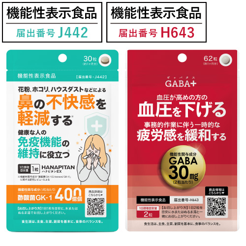 | 機能性表示食品 届出番号 | ハナピタンEX:J442 ギャバタス:H643 |