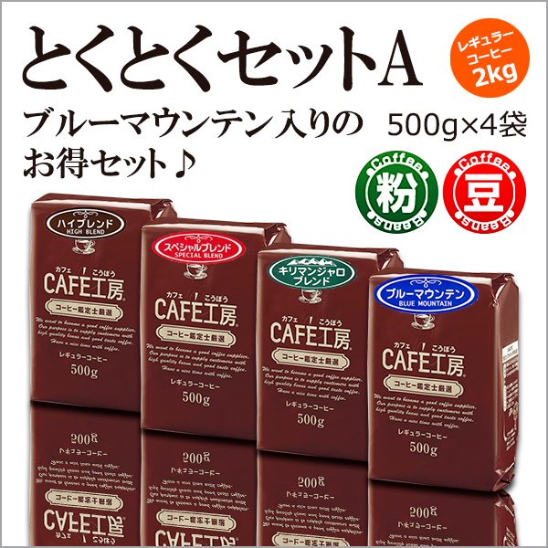 レギュラーコーヒー4種類計2kgのお得セットです。とくとくセットAはブルーマウンテンNo.2が入ってお得です。