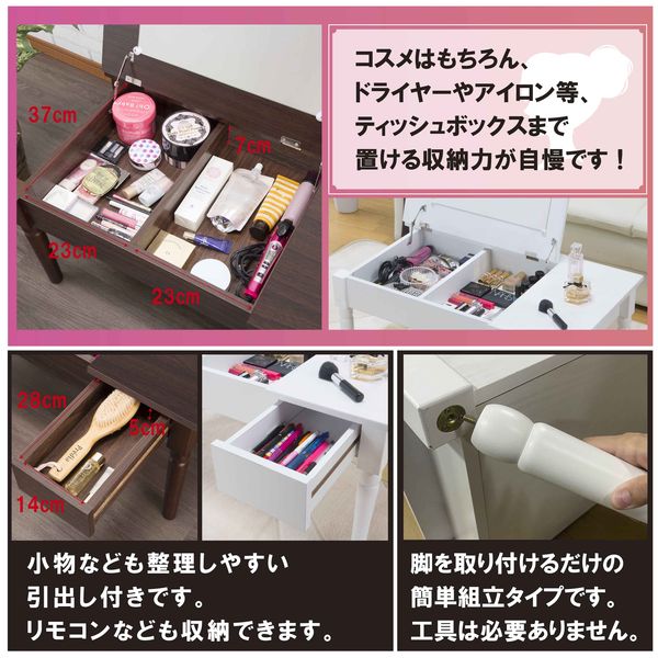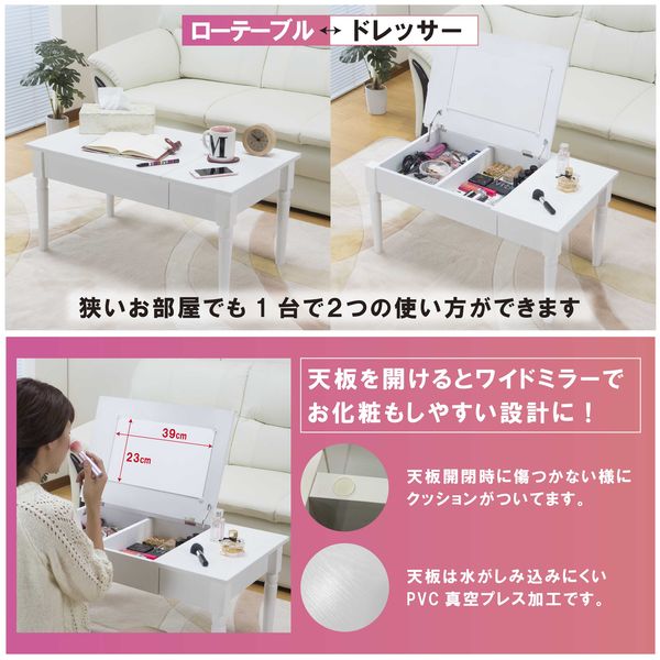 ・天板を開けるとテーブルがドレッサーに早変わり、狭いお部屋でも憧れのドレッサーが置けちゃいます。