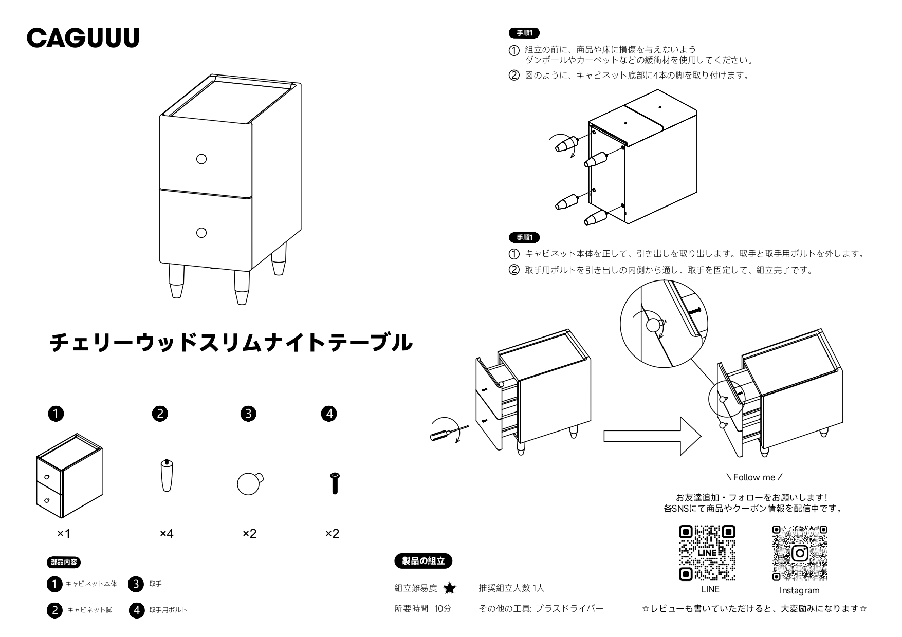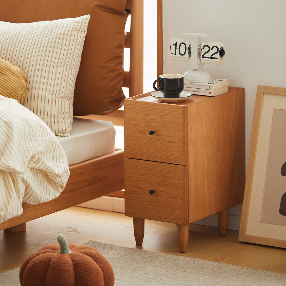 CAGUUU チェリーウッドスリムナイトテーブル 多機能サイドキャビネット 寝室サイドテーブル 引き出し2段 無垢材 木製 小物収納