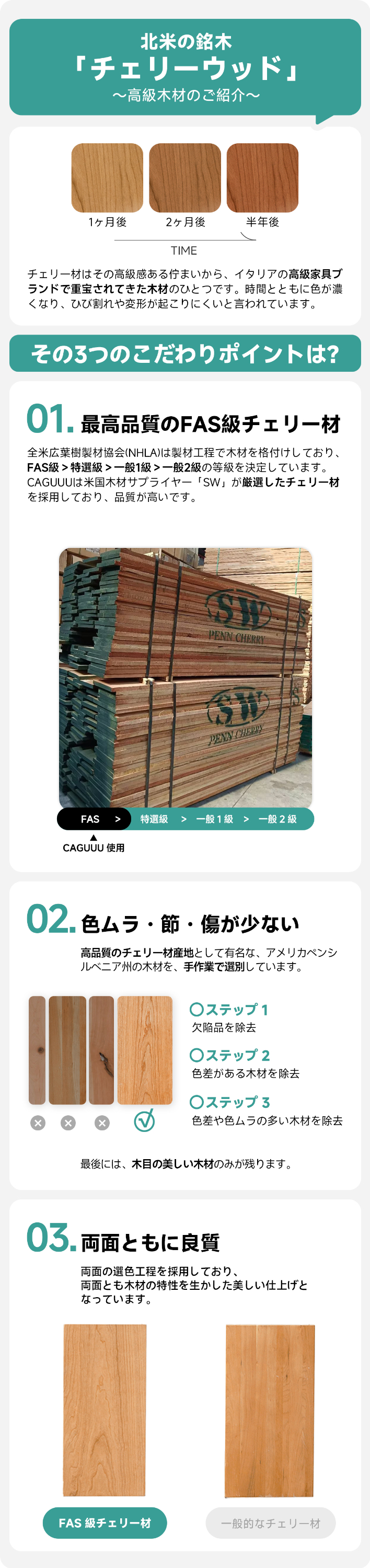 ・北米産チェリー材/ブナ材: 引き出し前板 側板 棚板 EO級合板: 引き出し先板 底板