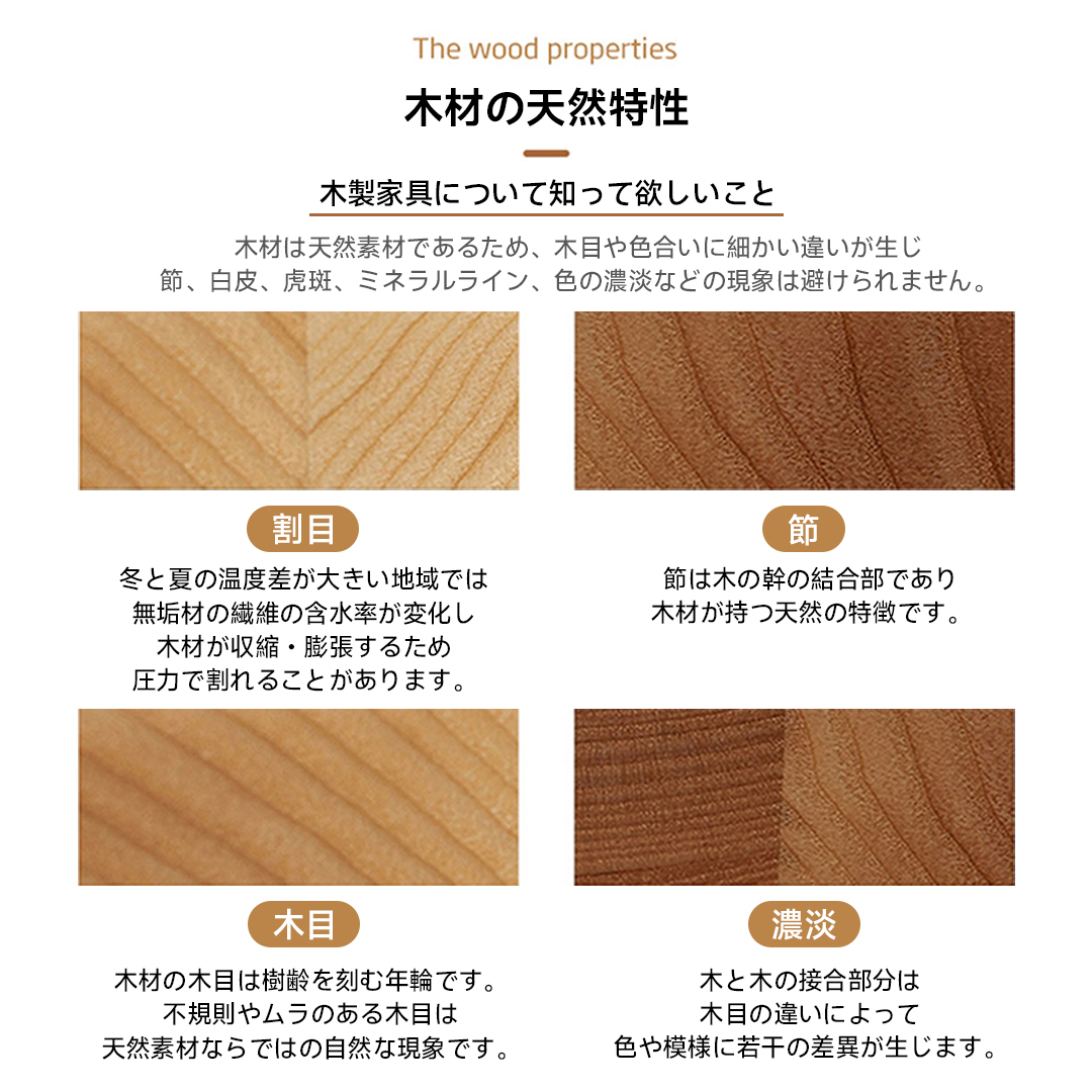 【高品質無垢材使用】:厳選された高品質の無垢材を使用しており、長持ちし、耐久性があります。自然な木の温もりと美しい木目が特徴で、どんなインテリアにも合わせやすいナチュラルなデザインです。