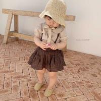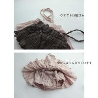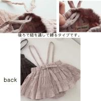 シャーリング加工でしわを付けた可愛いサスペンダースカートです。中はブルマになっているのでめくれてもオムツが隠れているので安心です。ブラウンとピンクの2色です。くすみカラーがまた可愛い。